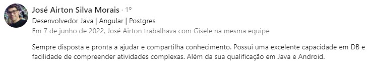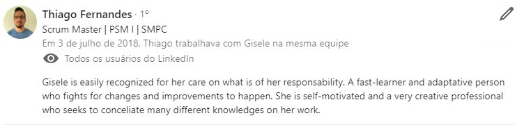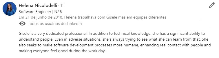 Gisele is a very dedicated professional. In addition to technical knowledge, she has a significant ability to understand people. Even in adverse situations, she's always trying to see what she can learn from that. She also seeks to make software development processes more humane, enhancing real contact with people and making everyone feel good during the work day.