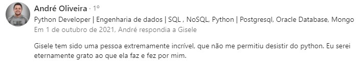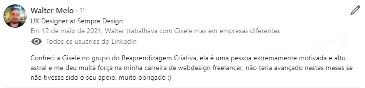 I met Gisele in the Reaprendizagem Criativa group, she is an extremely motivated and high-spirited person and has given me a lot of strength in my freelance web design career, I would not have advanced in these months if it had not been for her support. thank you very much :)
